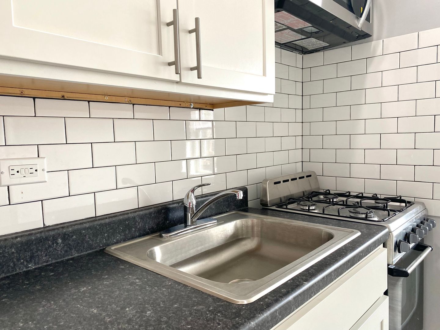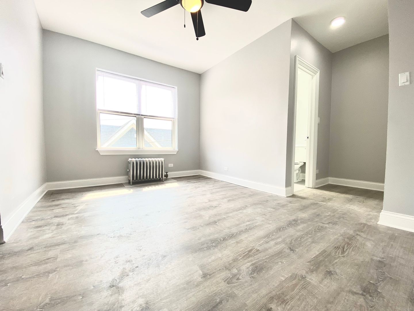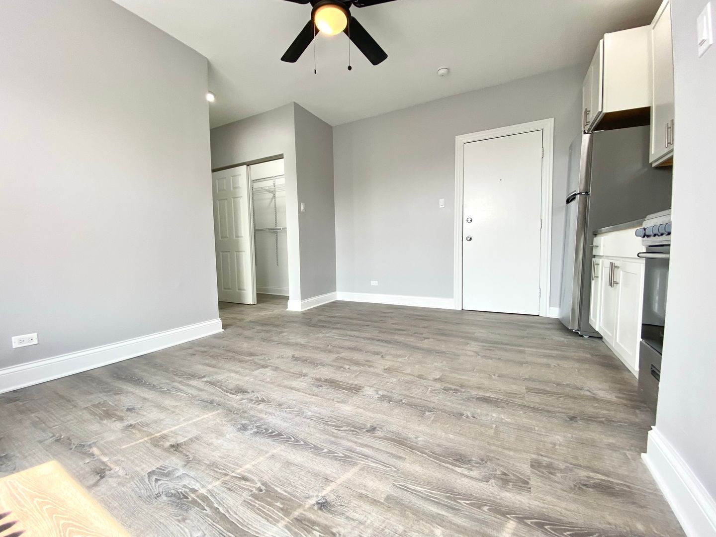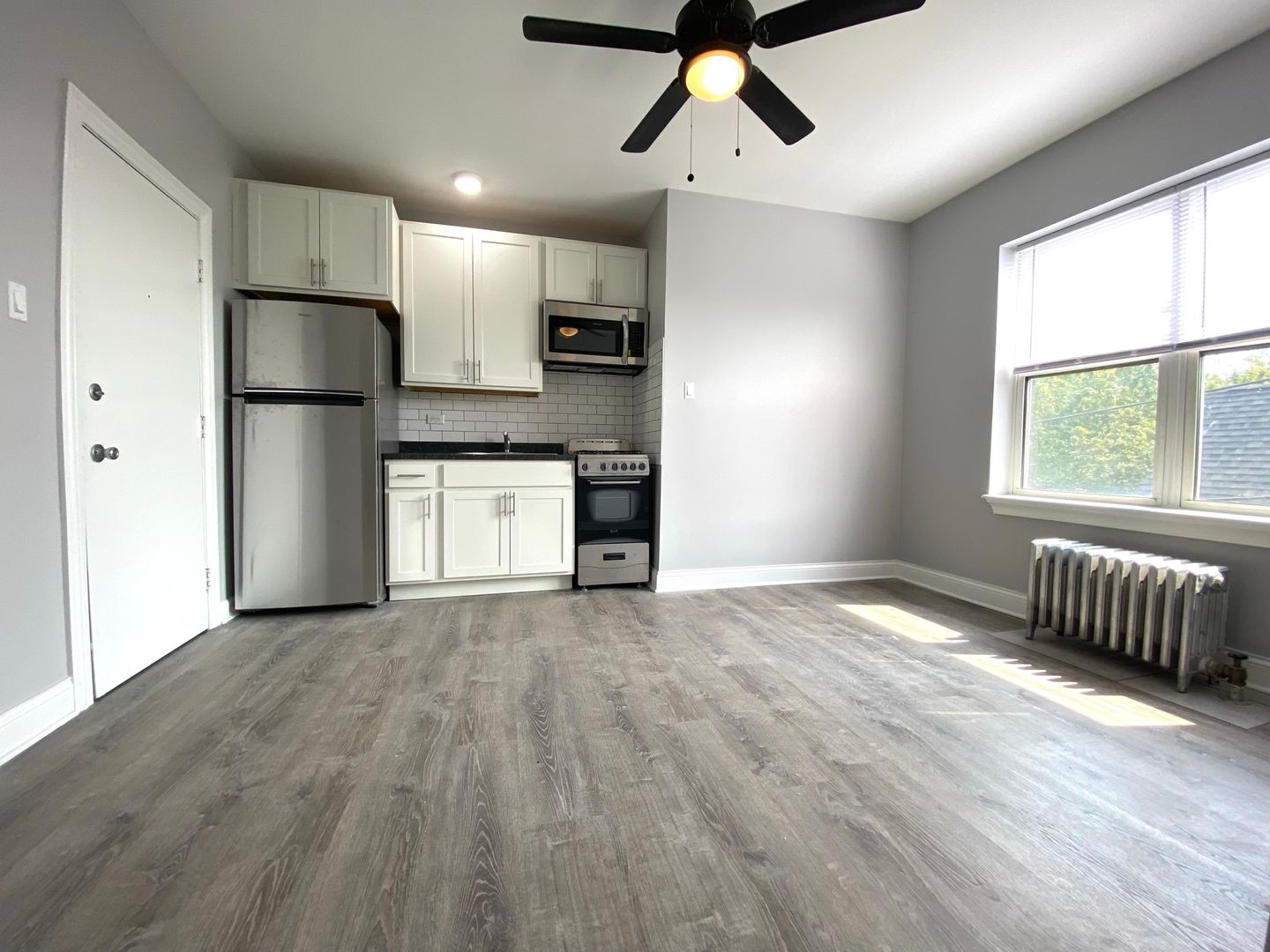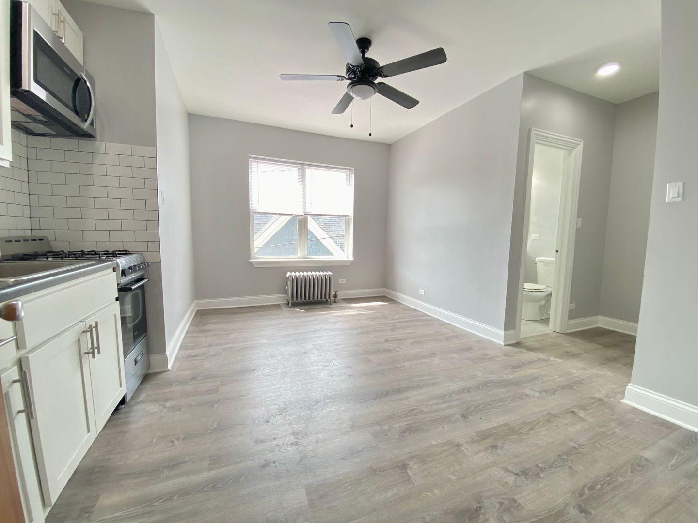 Discover 4756 Maplewood, a studio apartment in Chicago featuring a gourmet kitchen with stainless steel appliances and a modern bathroom. The open layout offers spacious living and sleeping areas with generous closet space, complemented by window treatments and ceiling fans throughout.